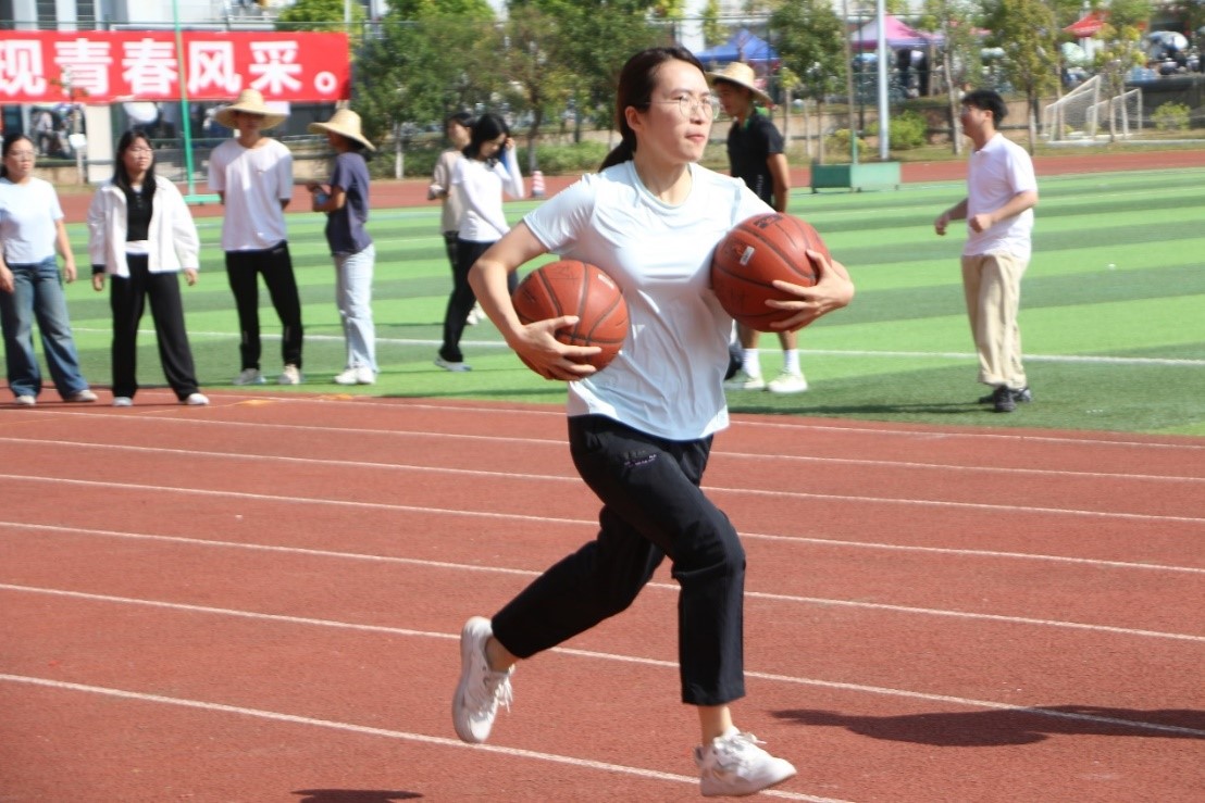 最后进行的是10×50米迎面抱球比赛。这项比赛不仅考验了教师们的短距离爆发力,更强调了团队间的默契配合。比赛开始,教师们抱着篮球快速冲向对面,途中既要保持速度又要确保球不掉落,场面既紧张又充满乐趣,赢得了现场观众的阵阵掌声。