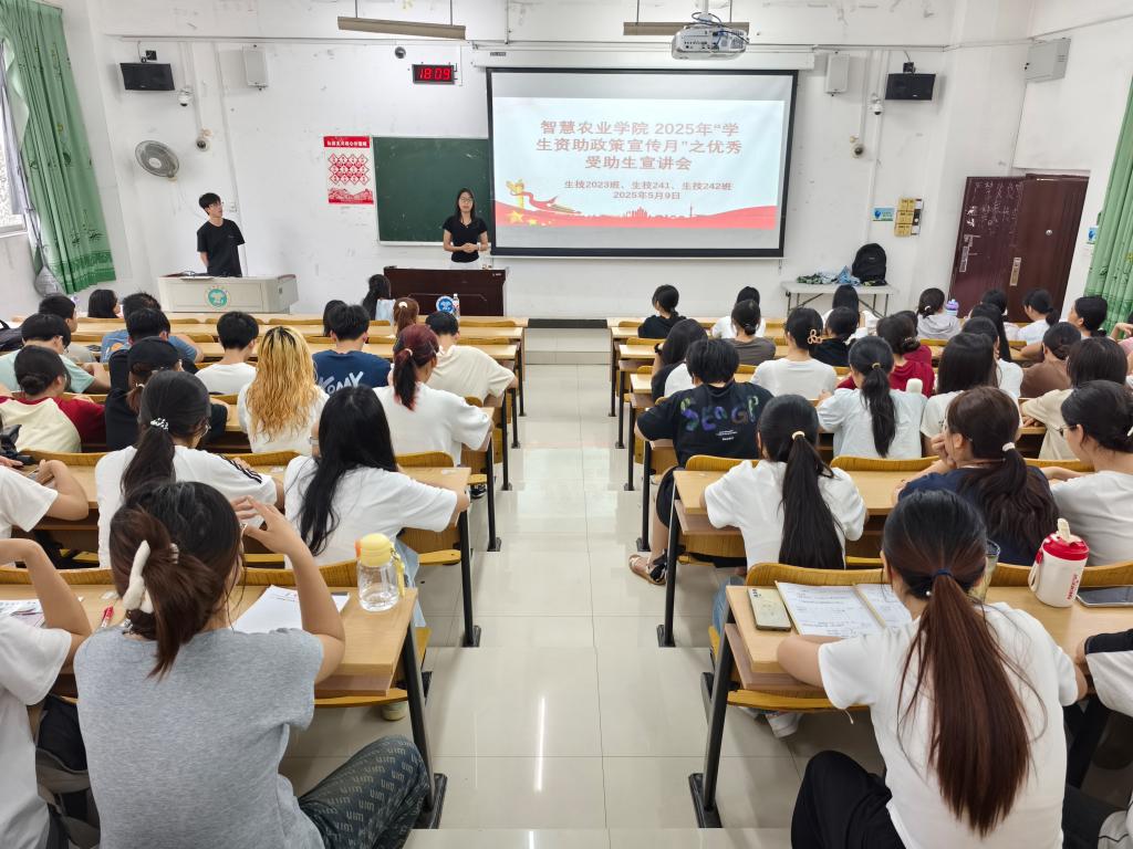 会议伊始,生技21班的黄宇雪、杨姝慧依次上台分享。她们结合自身求学经历,向同学们讲述她们在国家资助政策的支持下,克服经济困难、专注学业的成长故事。从生活条件的改善到学习目标的实现,她们生动地展现了资助政策带来的积极变化,鼓励同学们坚定信心、勇敢追梦。真挚的情感与励志的经历,深深感染了在场的每一位同学。随后,生技241班班干部从多阶段系统解读资助政策:学前教育阶段的免保教费、义务教育阶段的“两免一补”、中等职业教育的免学费与助学金,以及普通高校的奖学金、助学贷款等。同时,还重点介绍了广西边境地区0 - 3公里员工专项资助政策。通过结合具体案例与数据,他将复杂政策化繁为简,确保同学们清晰掌握。